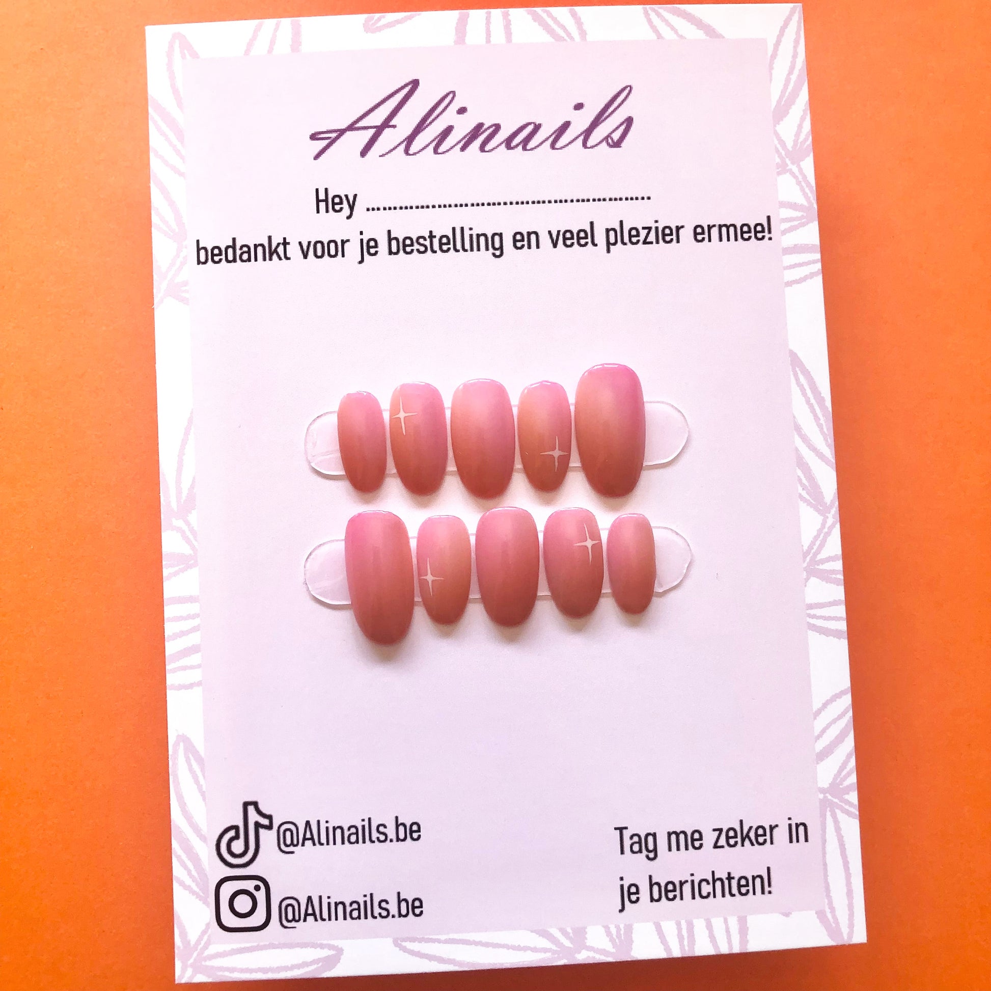 Voor elke set nagels die u besteld, ontvangt u een applicatiekit. Hierin zit alles wat u nodig hebt om de nagels aan te brengen (exclusief de nagellijm tabs, indien u deze wil moet u ze er apart bijbestellen), en ook de instructies voor het aanbrengen en verwijderen van de nagels zitten er altijd bij en kan u ook hier terugvinden.
